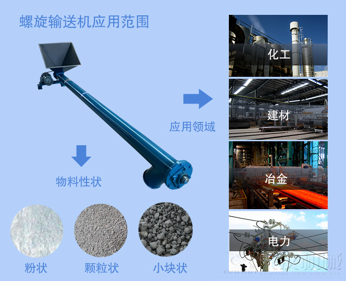 螺旋機廣泛應用於建材,化(huà)工,電力,冶金,木炭,糧食等行業。 它適合水平或傾斜(xié)地輸送粉狀,顆粒狀和小塊狀物料,例如煤,灰,渣,水泥(ní)和穀(gǔ)物等,輸送物料(liào)溫(wēn)度低於200°C。 螺旋輸送機不適用於輸送容(róng)易變質(zhì),黏稠和結塊的物料。