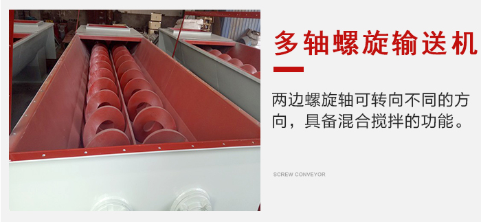 而多軸螺(luó)旋輸送機則是兩邊(biān)螺旋軸轉向不同的(de)方向,具體混(hún)合攪拌的功能。