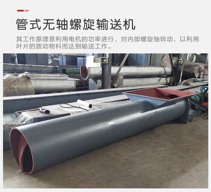 管(guǎn)式無軸螺旋輸送機其,工作(zuò)原理與(yǔ)管式有軸螺旋輸送機的工作原理大致相同,其都是利用電機的功率進行(háng)工(gōng)作的(de)實現,然而它們之間的不同就是其,有(yǒu)/無螺旋軸的區別(bié)