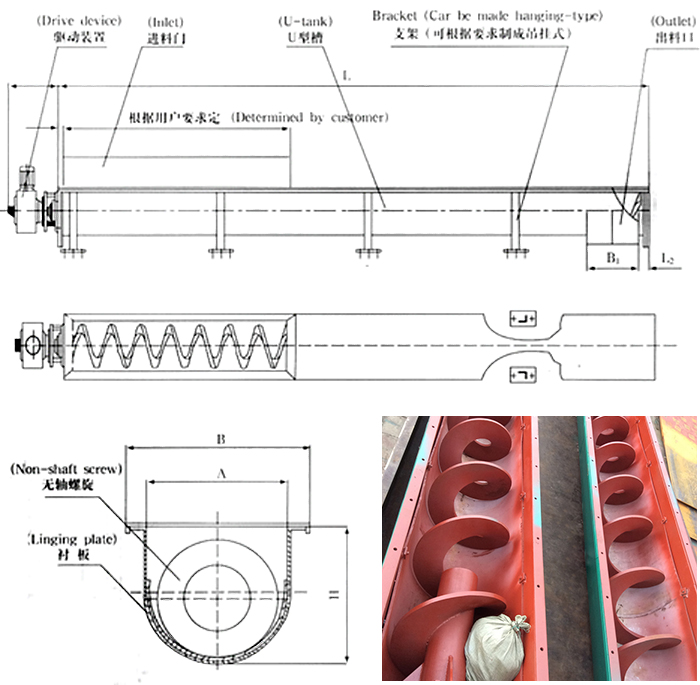 無軸螺旋絞龍輸送機由(yóu)無(wú)軸螺旋、U型槽、襯板、蓋板、進出口和驅動裝置組成(chéng)。