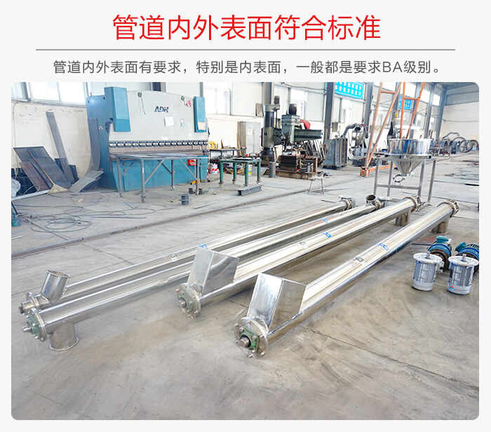 除了材質以外,還對管道(dào)內外表麵有(yǒu)要求,特(tè)別是內表麵(miàn),一般都是要求BA級別,管道表麵的光潔標準主要有AP、BA、EP三種,EP是(shì)電化學級別比較貴!所(suǒ)以(yǐ)不鏽(xiù)鋼螺旋輸(shū)送機使用(yòng)到食(shí)品行業是可以的。