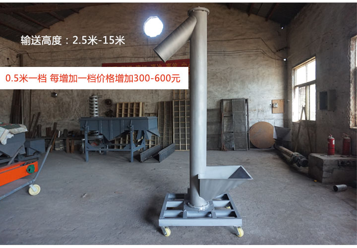 垂直螺旋輸送機的輸送高度在(zài)2.5米-15米;每0.5米為一檔,每(měi)增加一檔,價格增加300-600元,大家(jiā)可根據需要(yào)選擇高度。