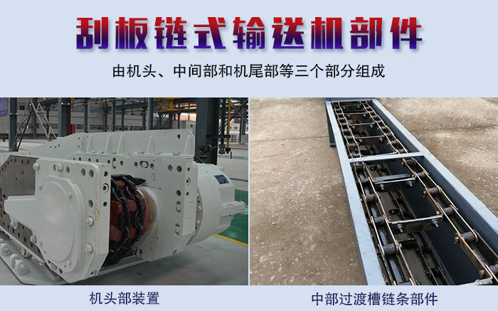 各種類型的刮板鏈式輸送機(jī)的主要結構和組(zǔ)成的部件基(jī)本是相同的,它由機頭、中間部和機尾部等(děng)三個部分組(zǔ)成。此外,還有供推移(yí)輸送機用的液壓千斤頂裝置和緊鏈時用的緊(jǐn)鏈器等附屬部件。機頭部由(yóu)機頭架(jià)、電動機、液力偶合器、減速器及鏈輪等件組成(chéng)。中部由過渡槽、中部槽、鏈條和刮板等(děng)件組成。機尾部是供刮板鏈(liàn)返回的裝置。重型刮板輸送機的機尾與機頭一(yī)樣,也設有動力傳(chuán)動裝置,從安設的位置(zhì)來(lái)區分叫上機頭與下機頭。