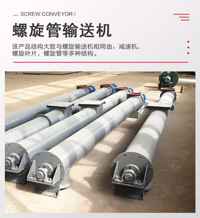 螺旋管輸送機就是螺旋輸送機,準確的(de)說(shuō)是(shì)管式螺旋(xuán)輸送機。該設備整體由圓管(guǎn)構成,所以(yǐ)很多人稱之為螺旋管輸(shū)送機。該產品結構大致與螺旋輸送機相同由:減速機,螺旋葉片,螺旋管等多種結構。