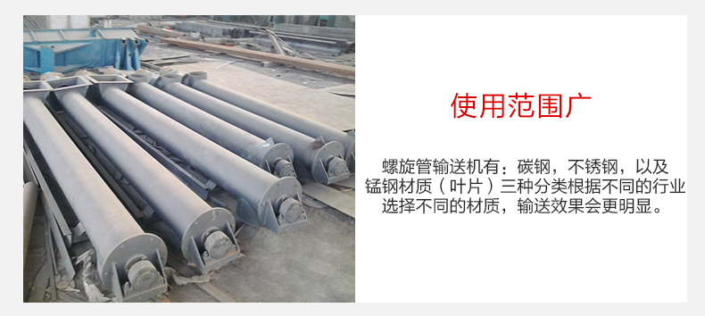 3,產品(pǐn)材質可供多個行業進(jìn)行(háng)選擇,螺(luó)旋管輸送機有(yǒu):碳鋼,不鏽鋼,以及錳鋼材質(葉(yè)片)三(sān)種分類根據不同(tóng)的行業選擇不(bú)同的材質,輸送效果會更明顯。