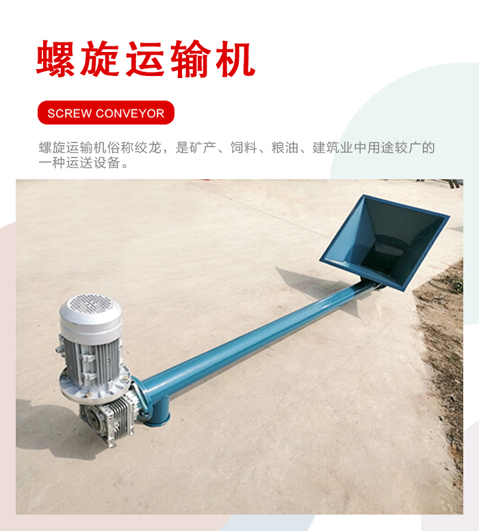 螺旋運(yùn)輸(shū)機俗稱絞龍,是(shì)礦產、飼料、糧(liáng)油、建築業中用途較廣的一(yī)種運送設備(bèi),從運送物(wù)料(liào)位移方向的角度區分,螺旋運(yùn)輸機分為水平式螺旋運輸(shū)機和筆直式(shì)螺旋運輸機兩大類型,首要用於對各種粉(fěn)狀、顆粒狀和小塊(kuài)狀等鬆(sōng)散物料(liào)的水平運送和筆直提高。
