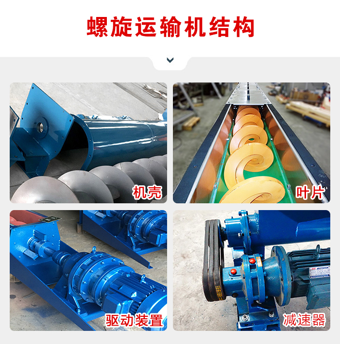 螺旋運輸機一般由運送機本體、進出料口及驅動裝置三大部分組成;螺旋運(yùn)輸機的螺旋葉(yè)片有實體螺(luó)旋麵、帶式螺旋麵(miàn)和葉片螺旋麵三種方式(shì),其中,葉片式螺(luó)旋麵應用相對較少,首要用於運送粘度較大和可壓(yā)縮性物料,這種螺懸麵型,在完成運送作業過程中,一起具有並完(wán)成對物料的拌和、混合等功(gōng)用。
