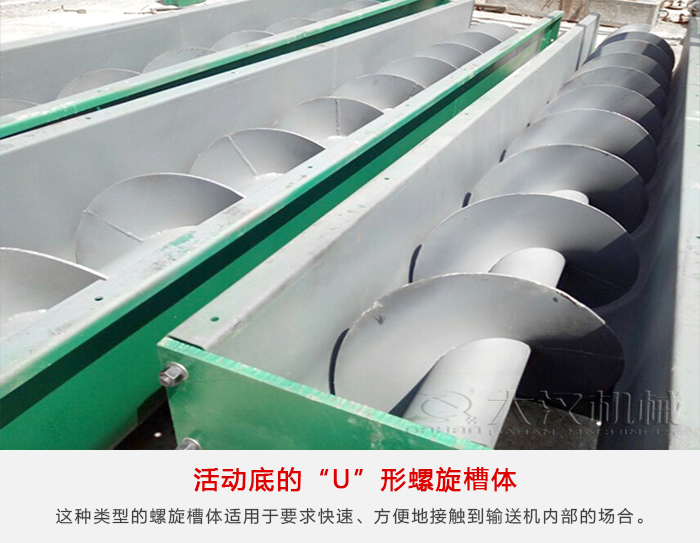 這種類型的螺旋槽體適用於要求快(kuài)速、方便地接觸到輸送機內部(bù)的場合。活動底的U形螺旋槽體由上部剛性的槽鋼與下部半圓形截(jié)麵槽上體所構成,半圓形(xíng)截麵槽體的一邊為鉸接麵,另一邊則采(cǎi)用彈(dàn)簧卡子夾緊或其他形式能快速打開的連接裝置(zhì)。