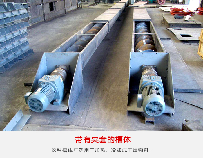 煤粉螺旋輸送機這種形式的槽(cáo)體由加工好的夾套連(lián)續地焊(hàn)接在普通結構的槽體上,其上焊有換熱介質的進出口管。這種槽體(tǐ)廣泛用於加熱、冷卻成幹燥物料。夾套中的隔板使循環水較好地分(fèn)配麵強化熱交換效果。