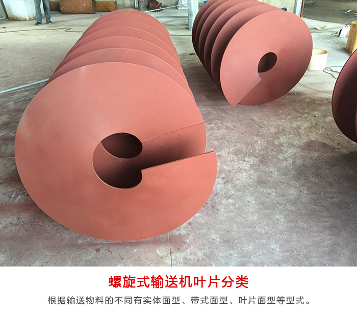 螺旋式輸(shū)送機旋轉軸上焊的螺旋葉片,葉片的麵型根據輸送物料的不同有實體麵型(xíng)、帶式麵型、葉片麵型等型式。