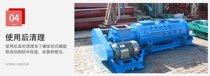 在帶(dài)使螺旋輸送機的,每(měi)次使用結束後,要注意螺旋(xuán)輸送機的清理工作,這也是為了確保帶式(shì)螺旋輸送機的損壞(huài)程(chéng)度,以及下次使用(yòng)時物料的幹淨。